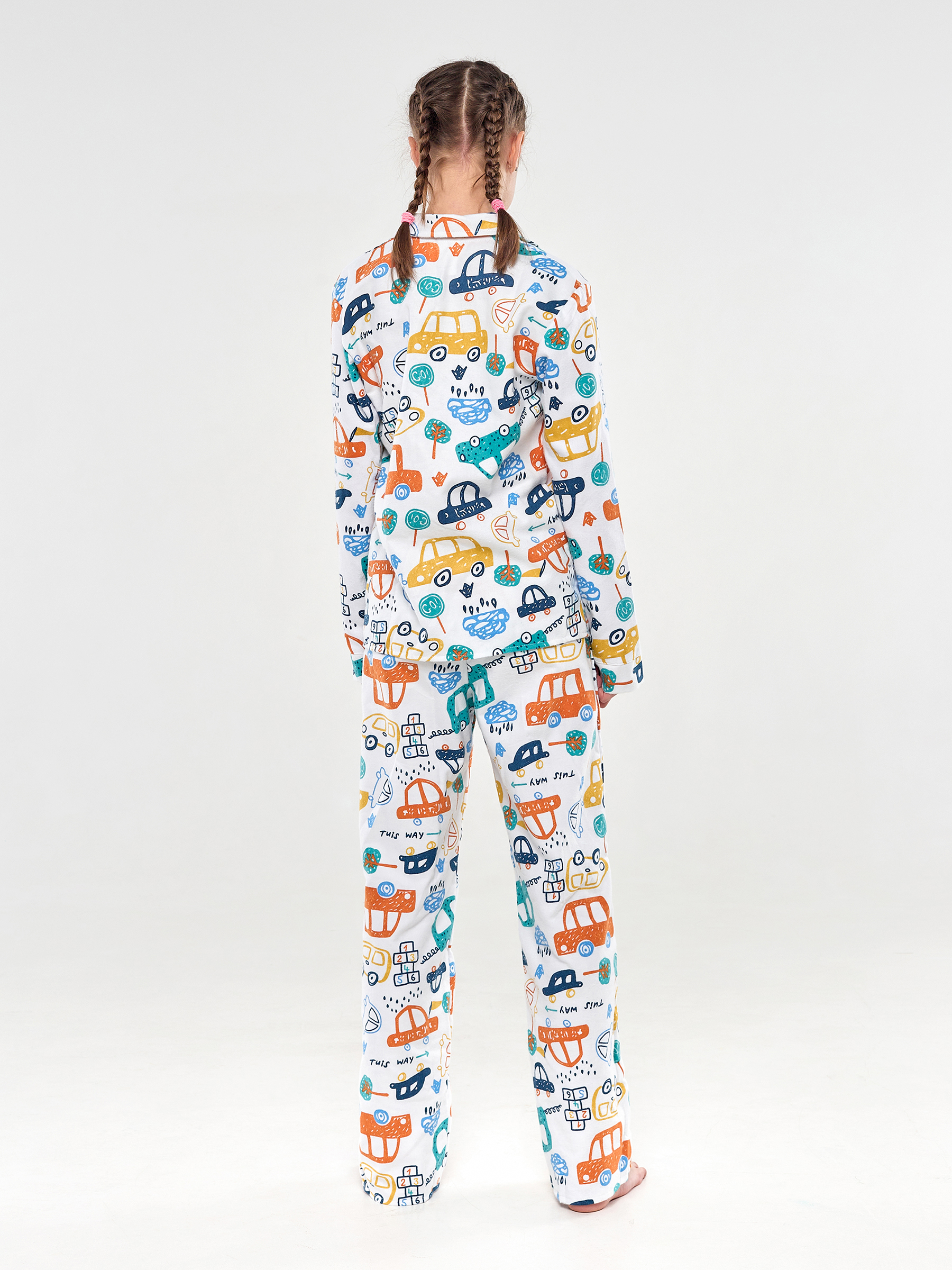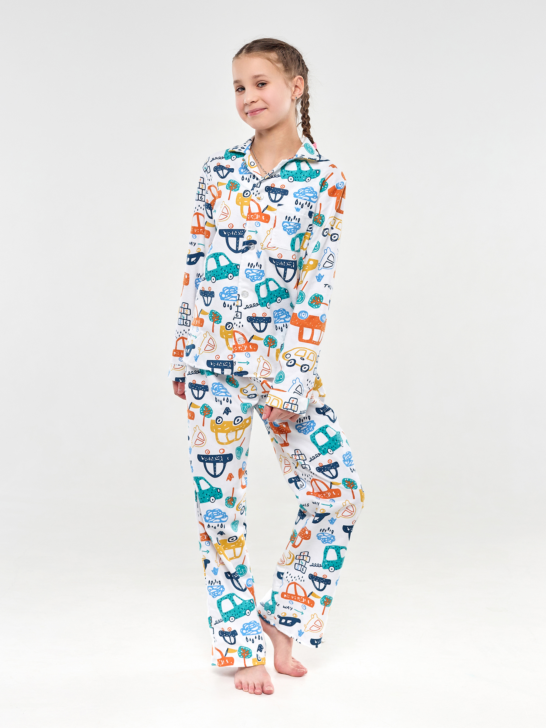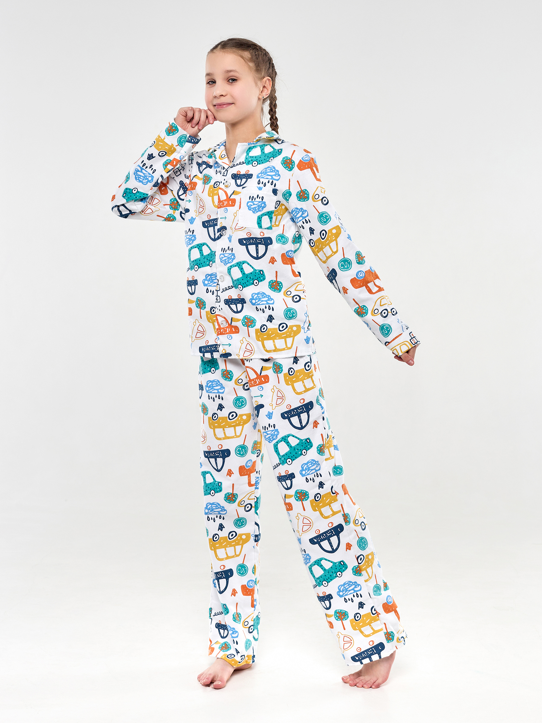 Пижама детская свободного кроя не будет стеснять движения во время активных, а также спокойных игр дома, состоит из длинных свободных штанов на резинке и рубашки с длинным рукавом на пуговицах.