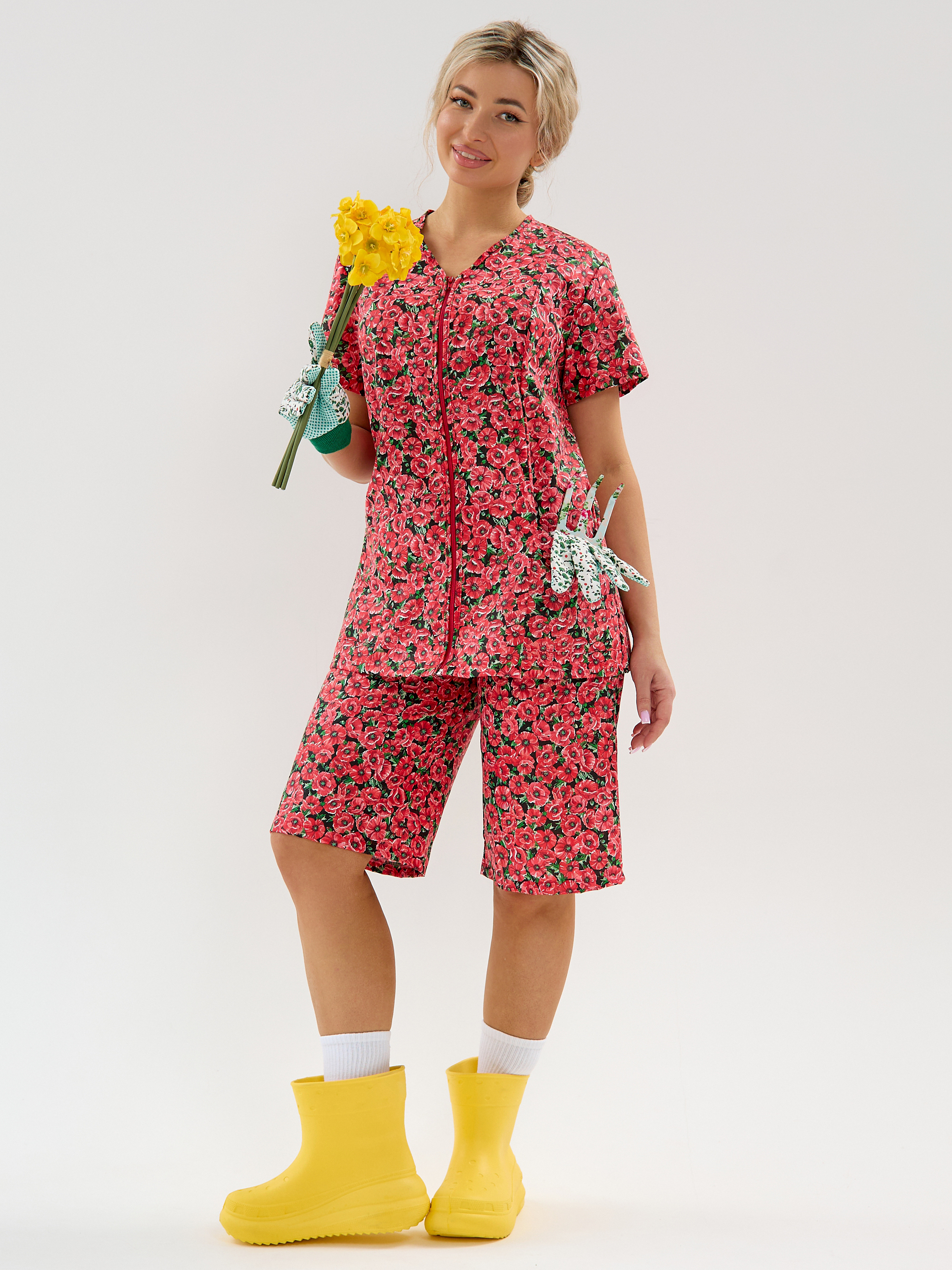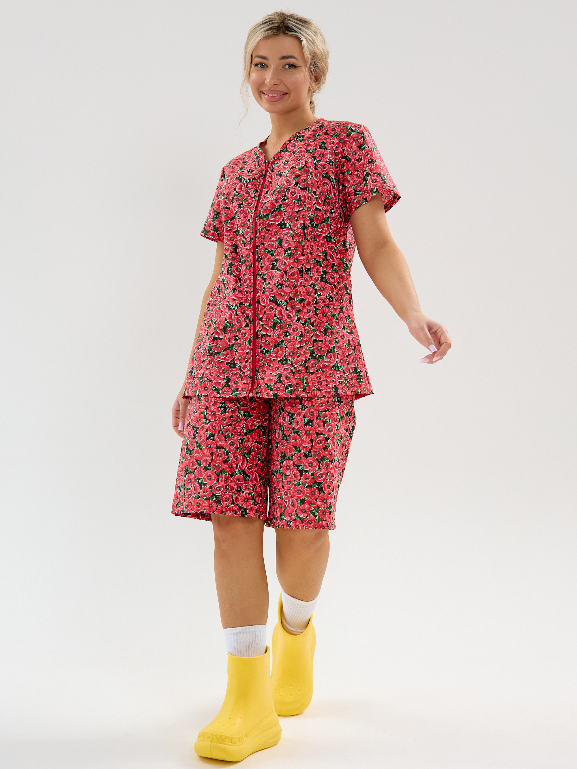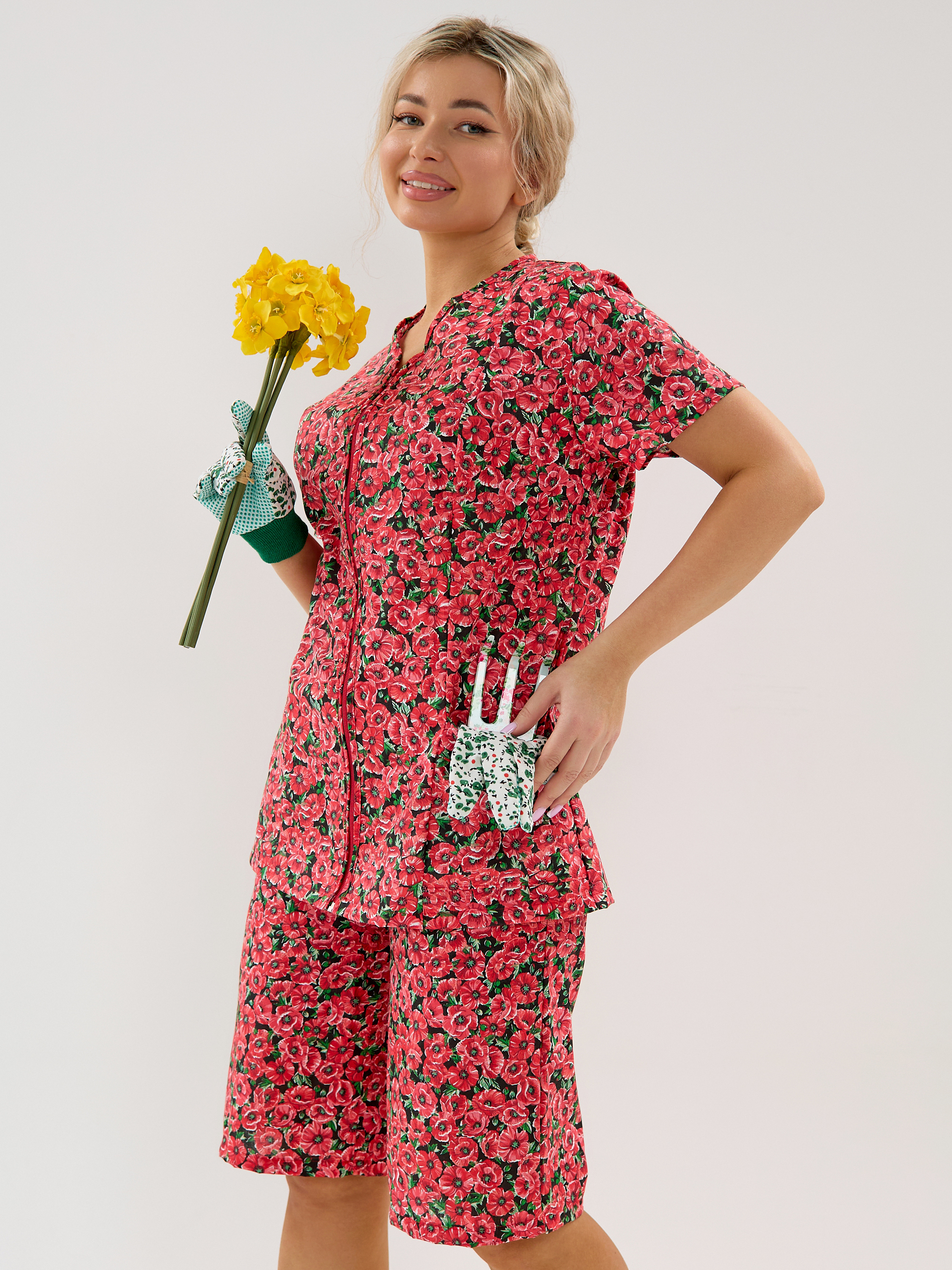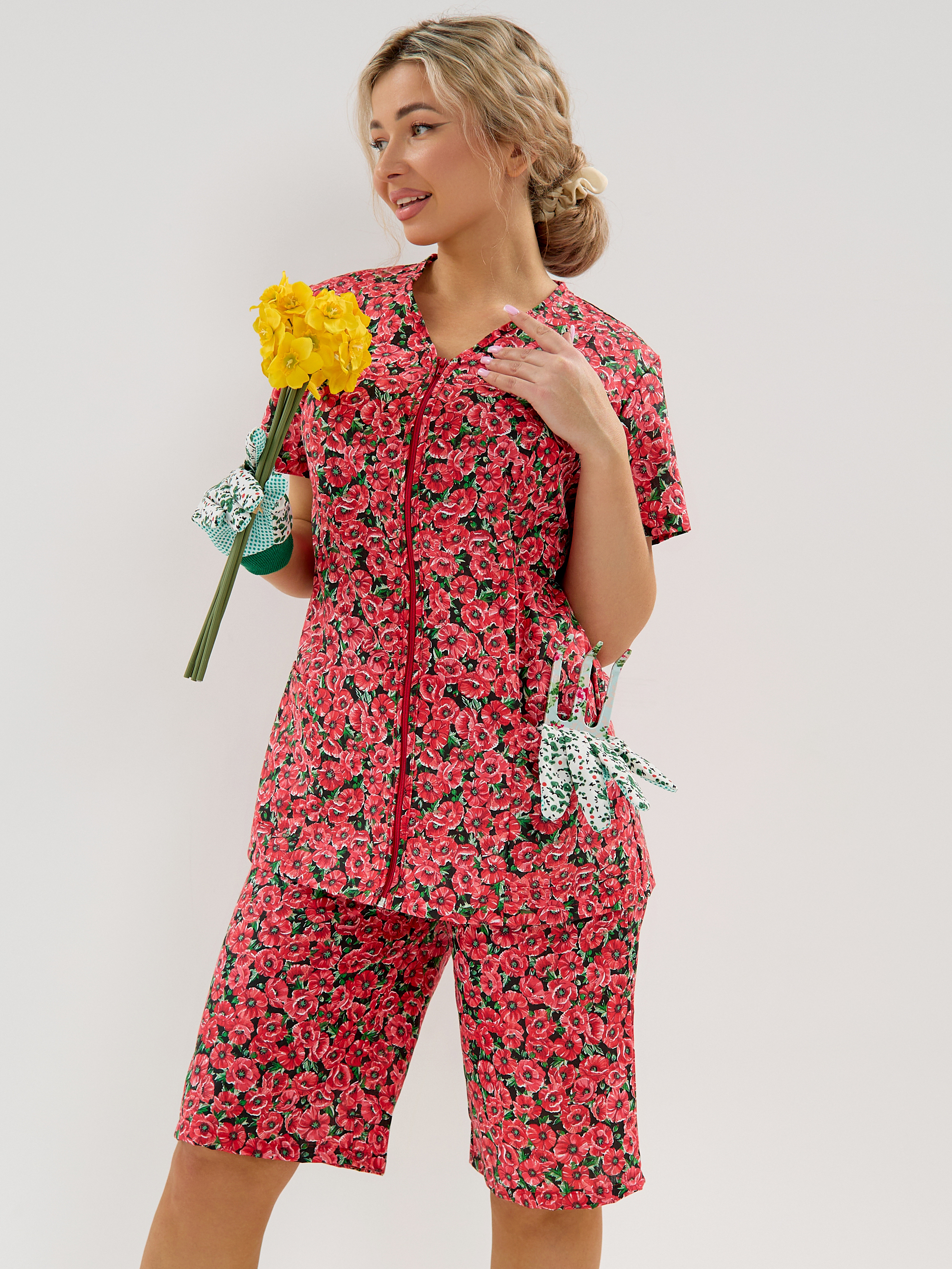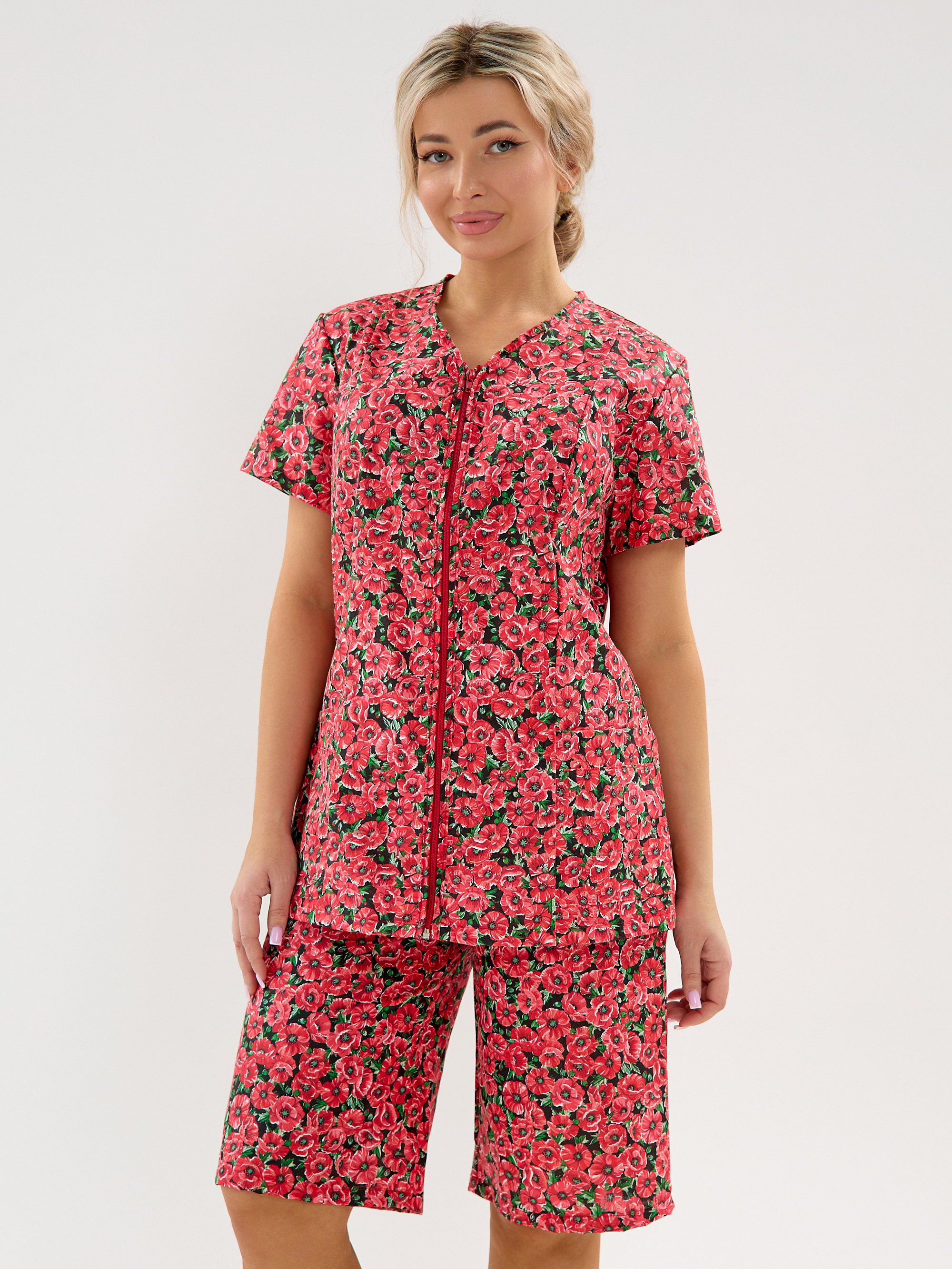 Женский дачный костюм из бязи, кофта на молнии с коротким втачным рукавом и карманами, шорты ниже колена на резинке. Натуральный 100% хлопок, дышащая ткань, тело будет дышать даже в самый жаркий день, свободный крой не будет сковывать движений. Яркий принт красные маки подчёркивает женственность. Идеален для дачи, огорода, дома, отдыха на природе, а также для путешествий и поездок на море. Шорты с комфортной посадкой поэтому будет удобно наклоняться и работать в огороде. Костюм домашний бязевый подходит для дел по дому, уборки и отдыха. В глубокие практичные карманы поместятся семена, перчатки, пара морковок «на перекус» и даже телефон с ключами, а также разные мелочи. Костюм женский летний прост в уходе, бязь устойчива к частым стиркам, хорошо держит форму.