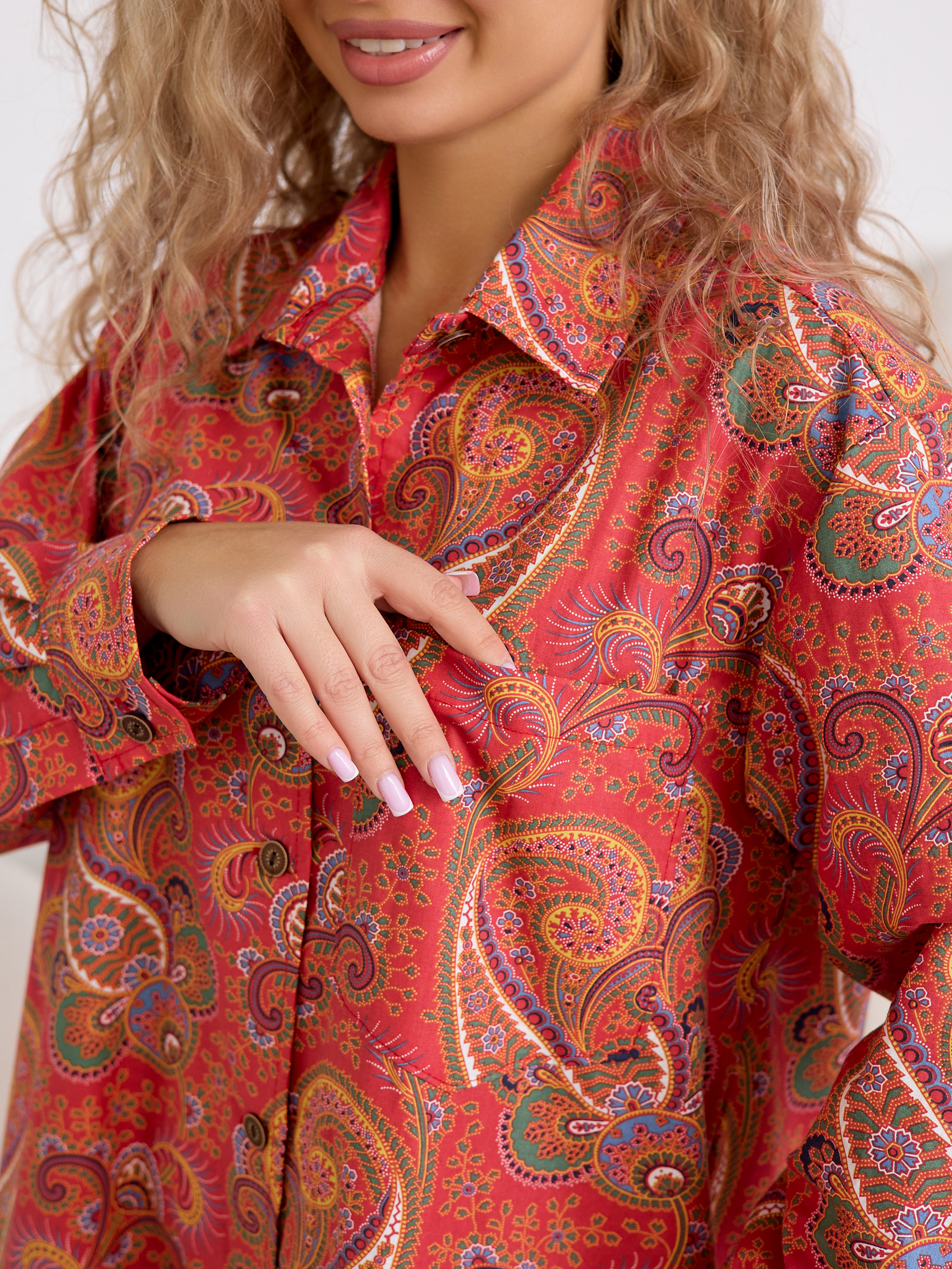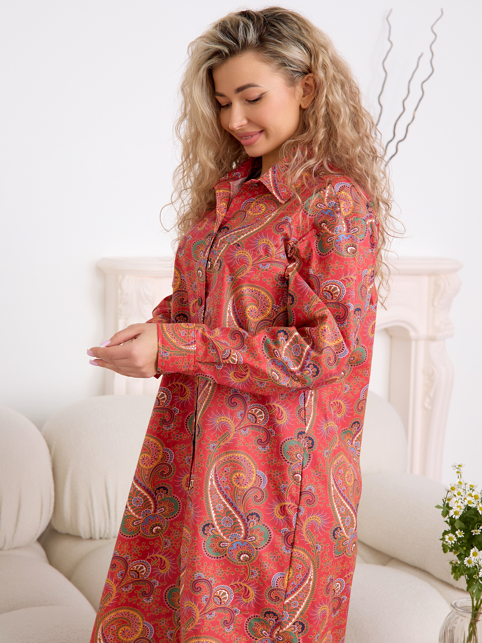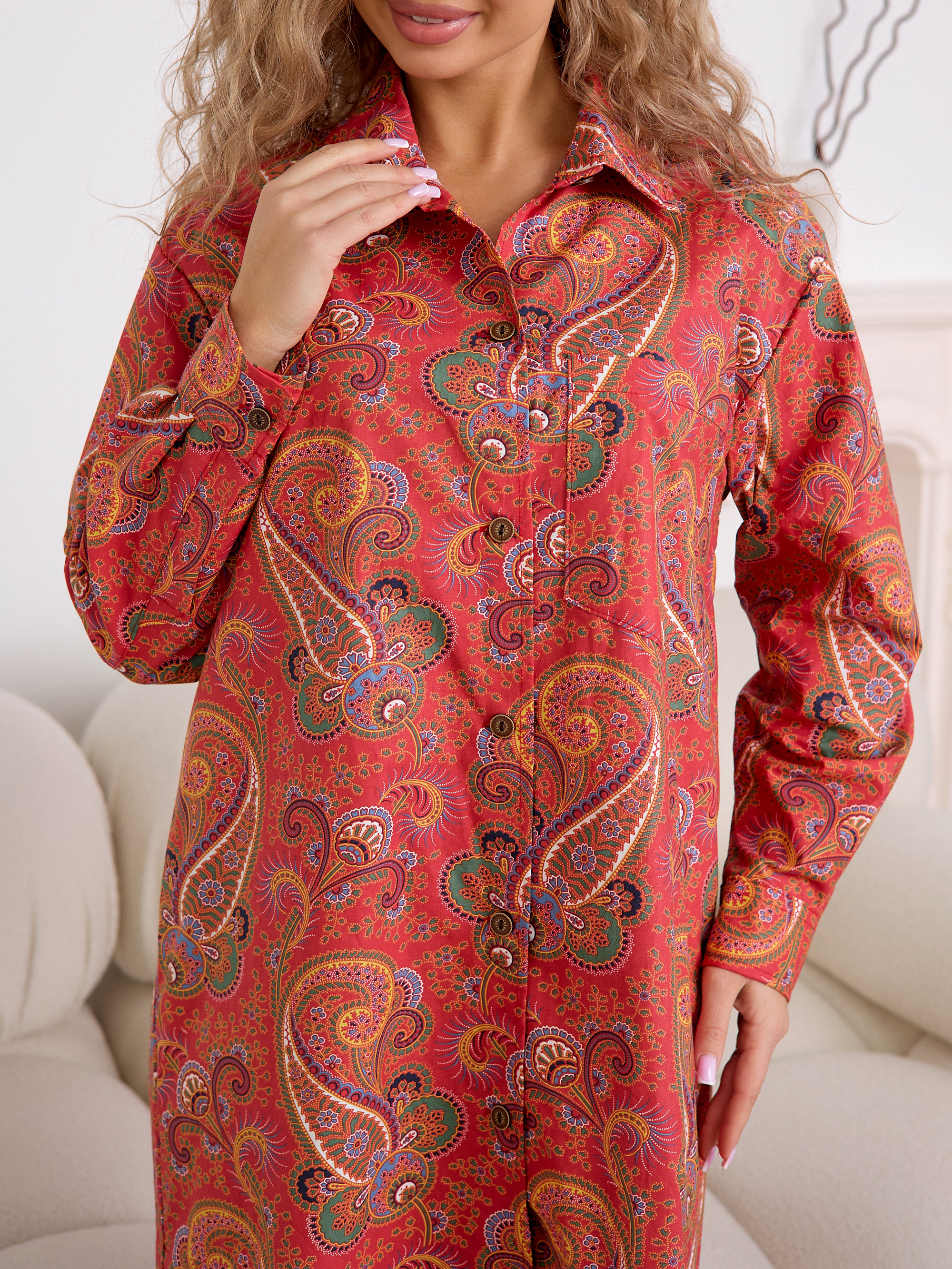 Уютный халат‑рубашка прямого кроя для дома и отдыха. Модель сочетает современный оверсайз‑силуэт с аутентичным принтом, воссозданным по образцам тканей Куваевской мануфактуры (1889–1915 гг.), ткань производства компании Шуйские ситцы.