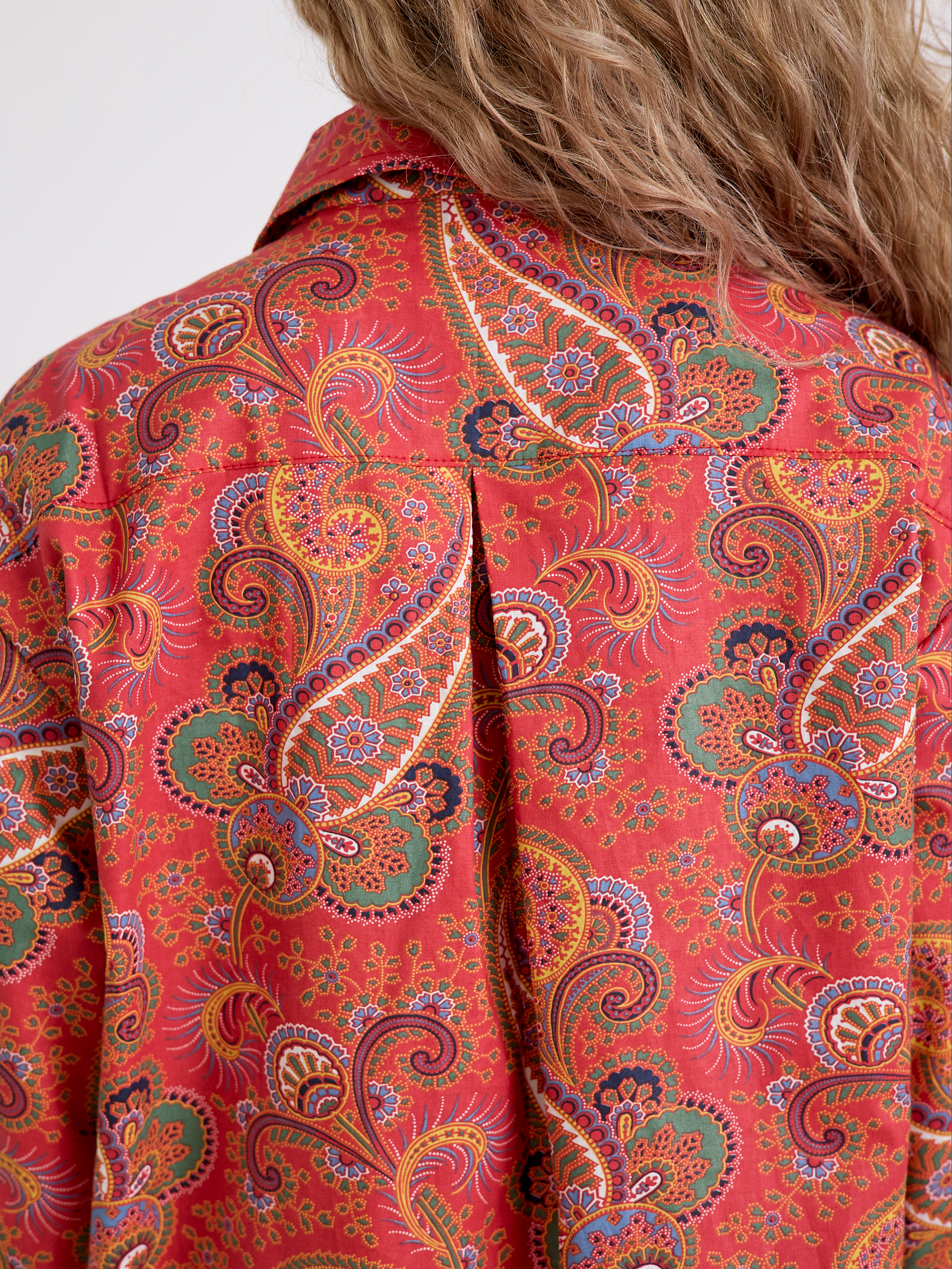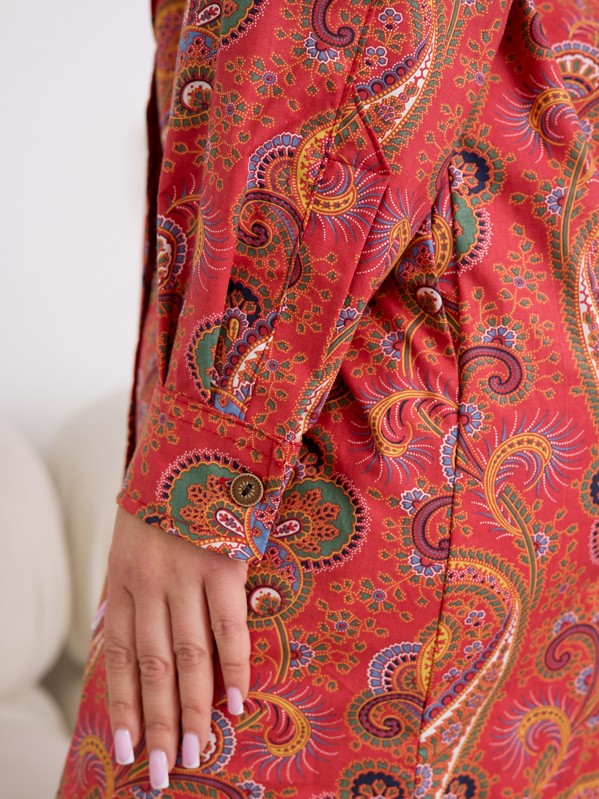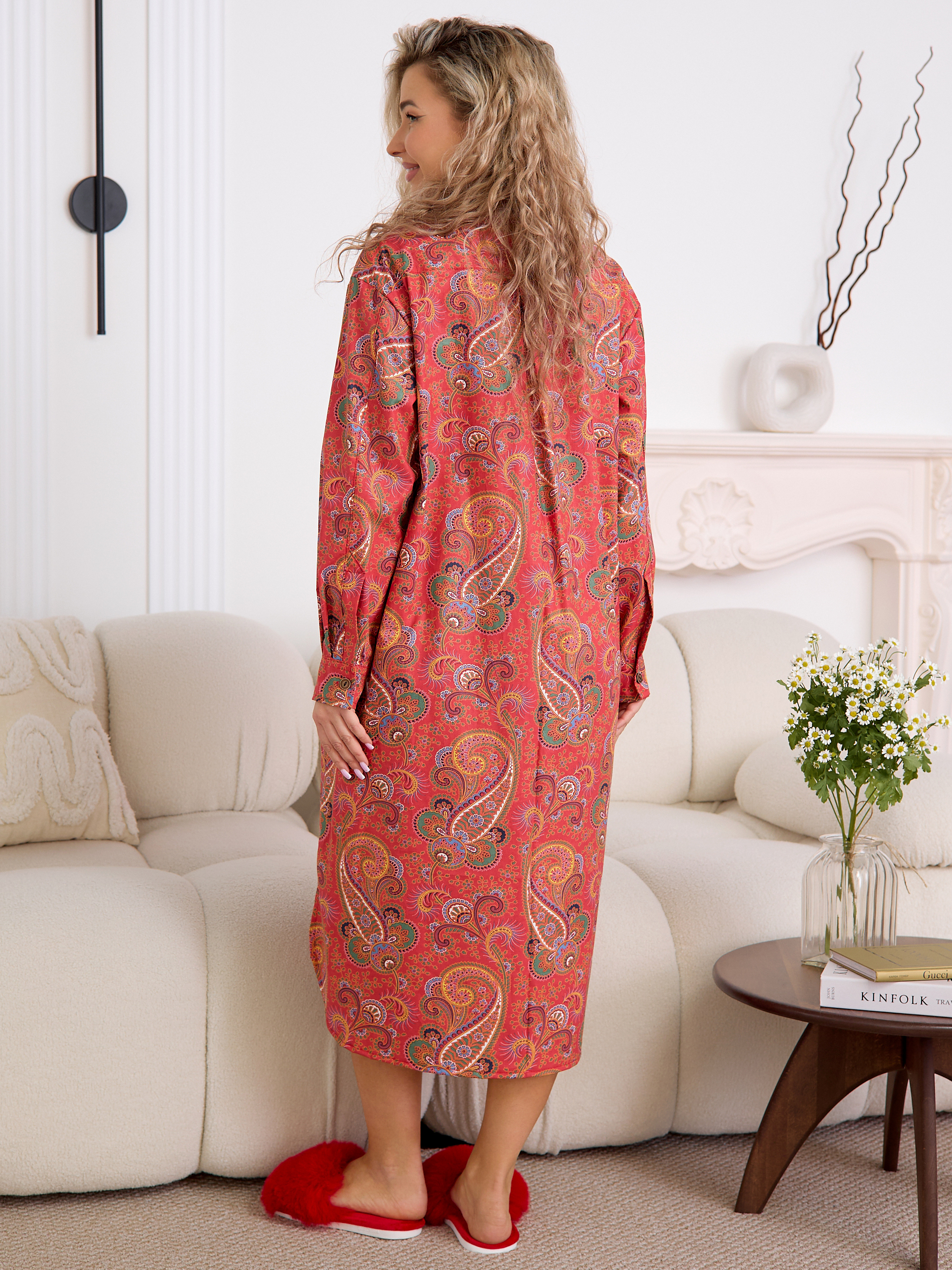 Уютный халат‑рубашка прямого кроя для дома и отдыха. Модель сочетает современный оверсайз‑силуэт с аутентичным принтом, воссозданным по образцам тканей Куваевской мануфактуры (1889–1915 гг.), ткань производства компании Шуйские ситцы.