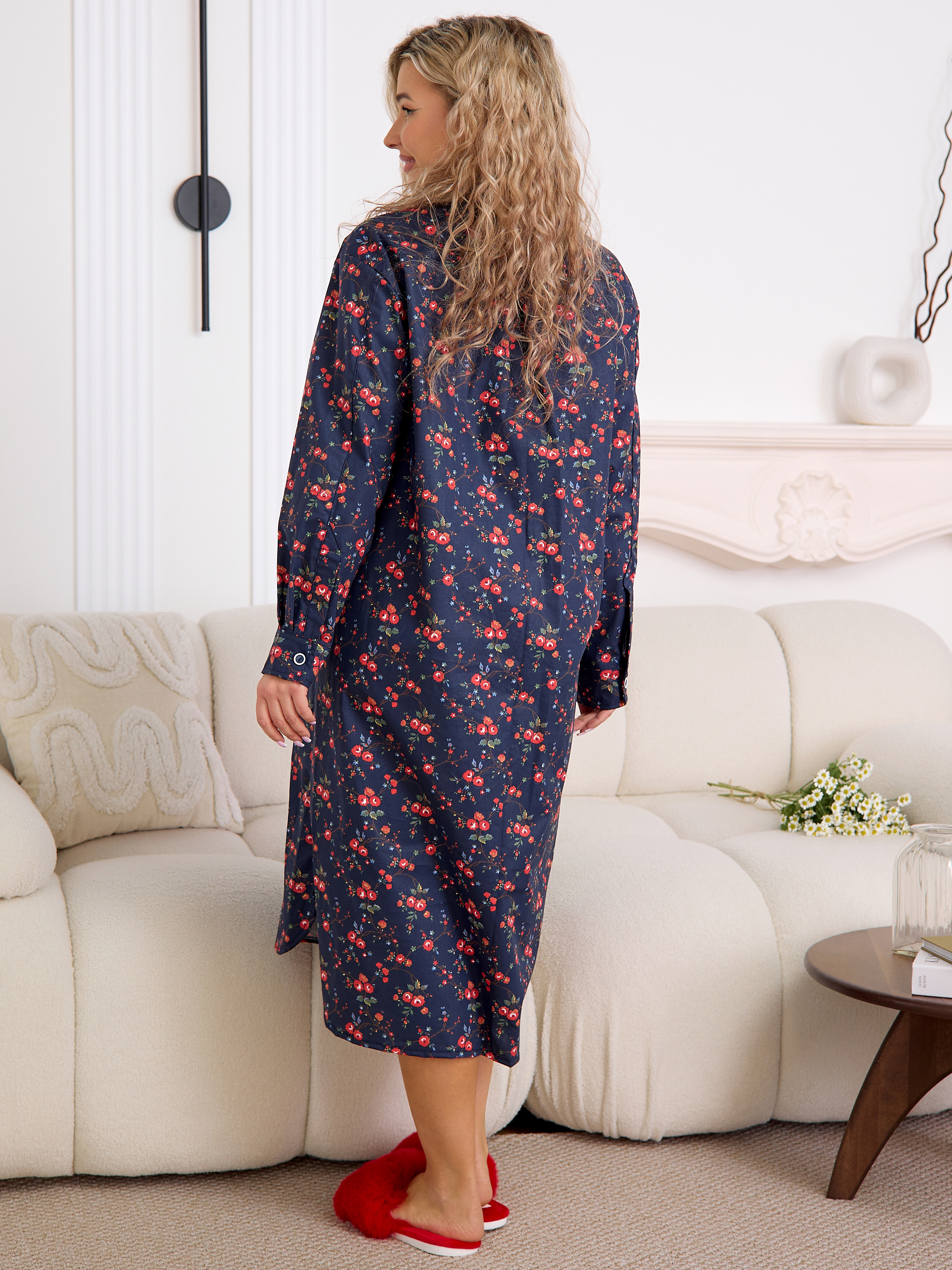 Уютный халат‑рубашка прямого кроя для дома и отдыха. Модель сочетает современный оверсайз‑силуэт с аутентичным принтом, воссозданным по образцам тканей Куваевской мануфактуры (1889–1915 гг.), ткань производства компании Шуйские ситцы.